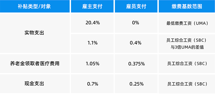 每年相关组织将更新最低缴费基数工资(UMA)。社会保险最高缴费基数为UMA的25倍。通常来说,雇员的缴费基数工资为其个人综合工资(SBC),包含个人基本工资、各类季度年度奖金、非现金津贴综合折算等。